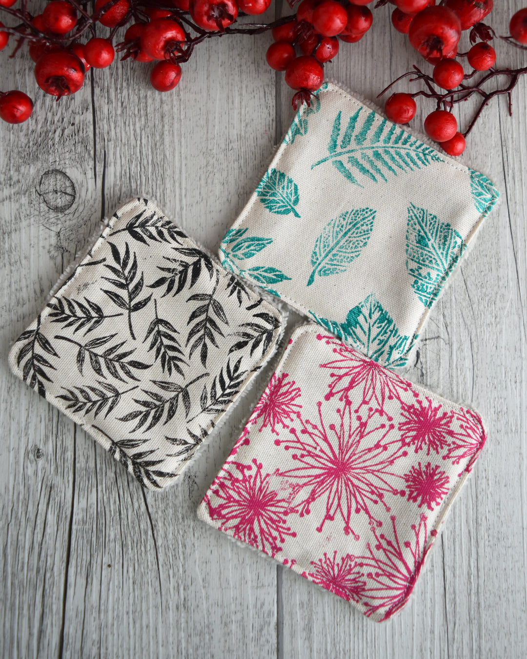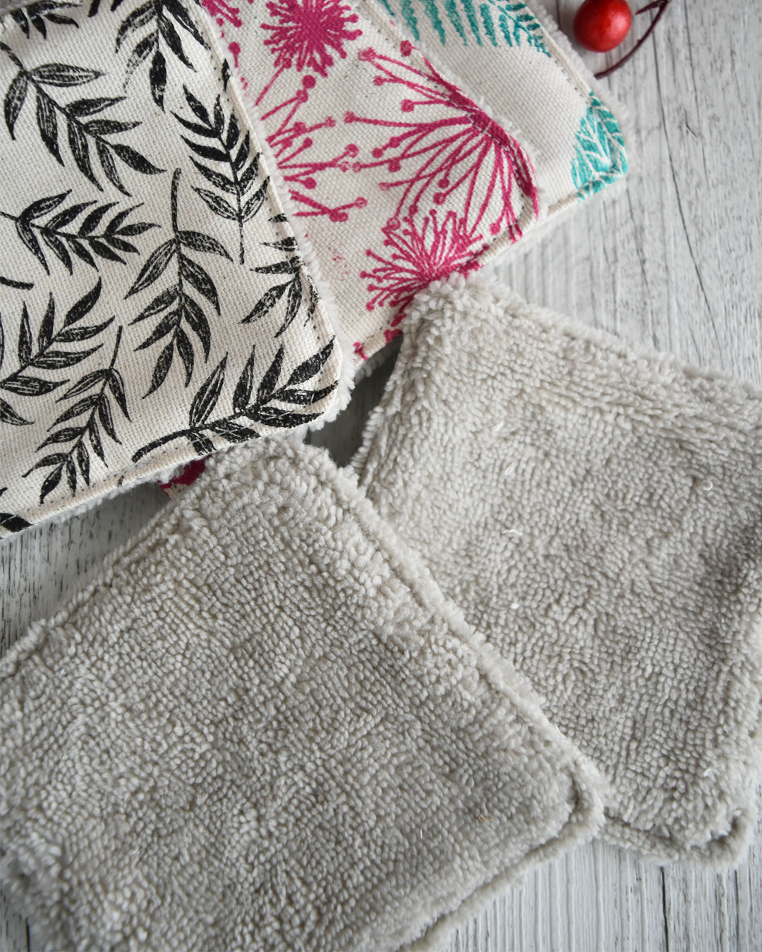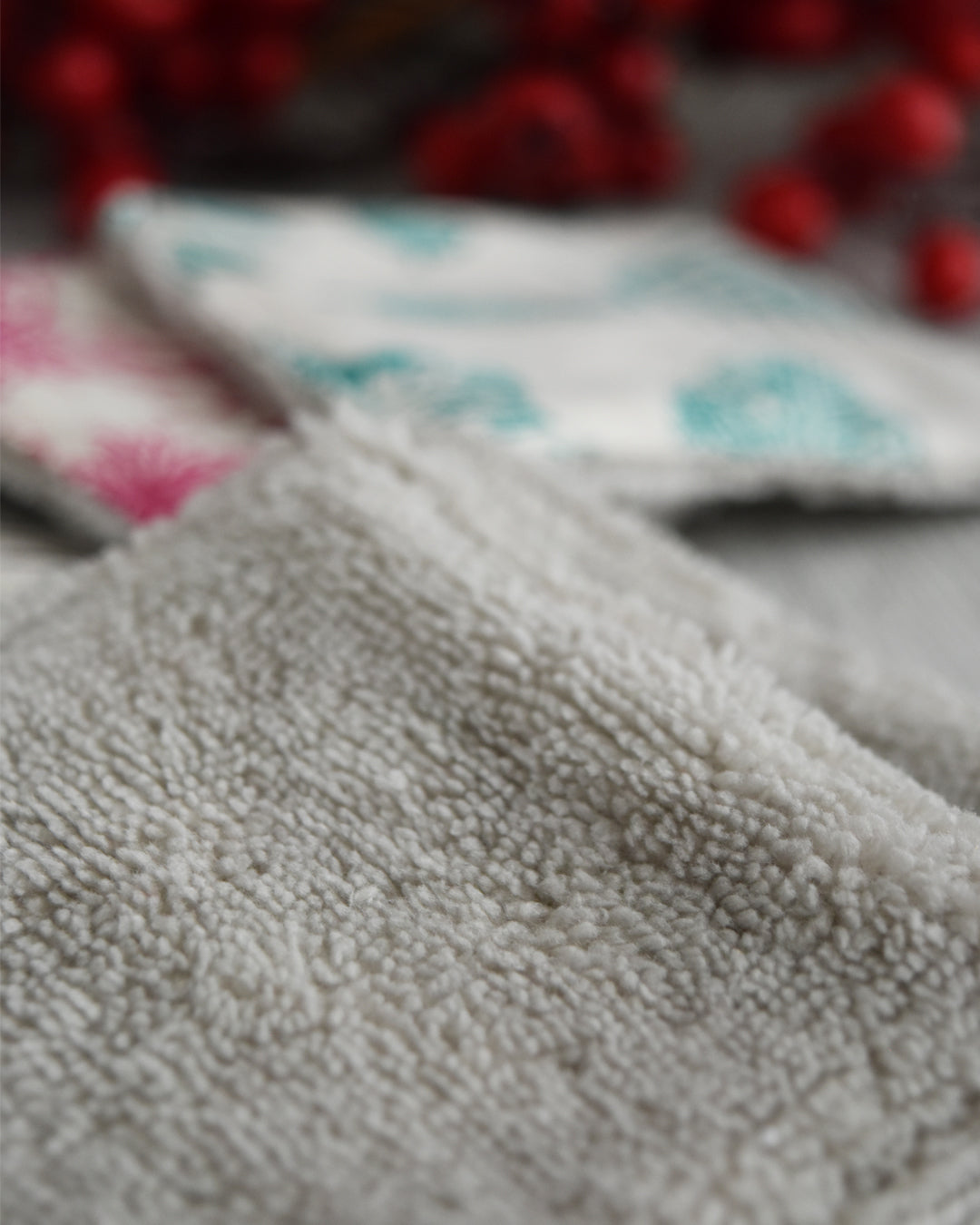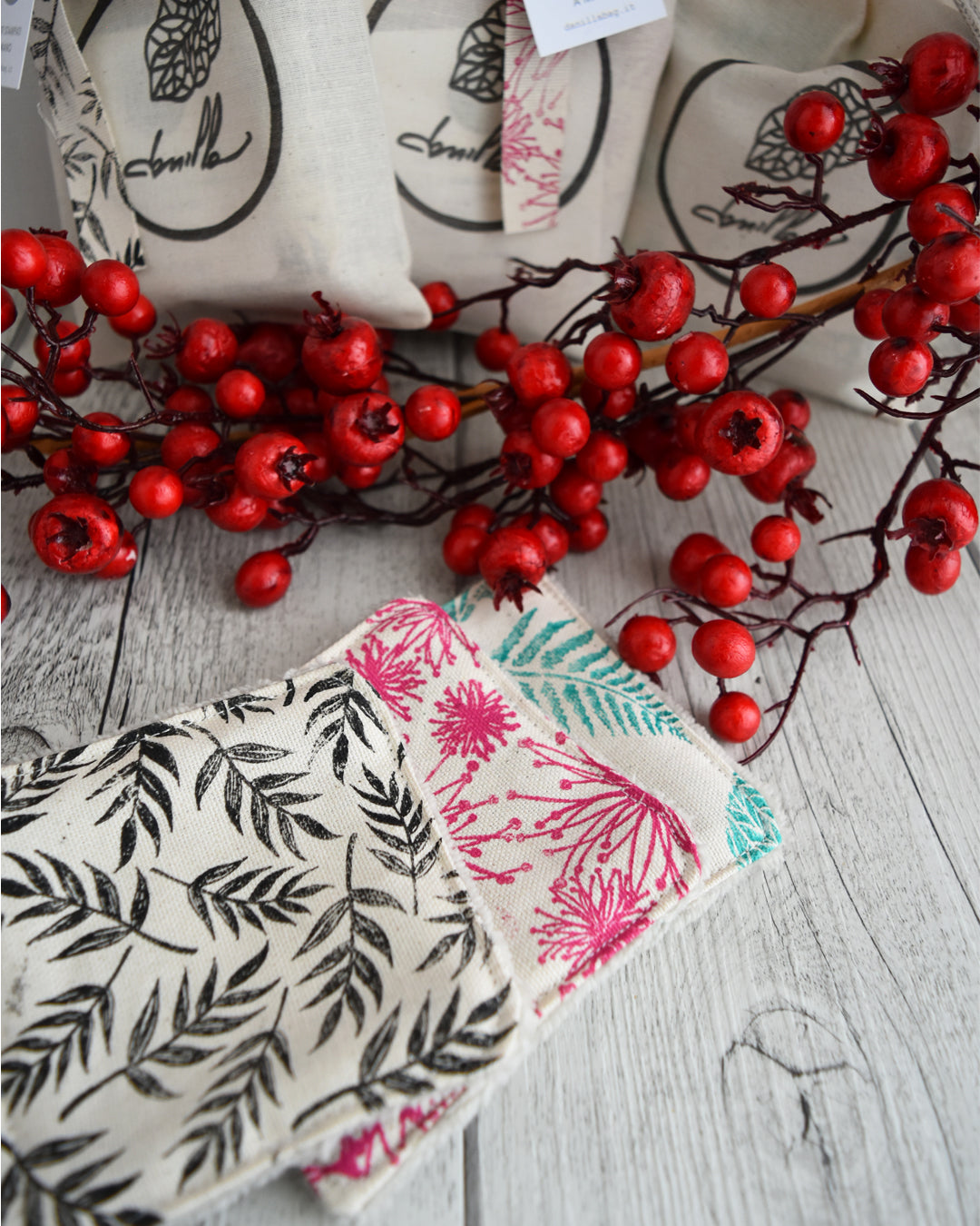 Set di 5 pad struccanti realizzati in spugna di bambù e tessuto 100% cotone con disegno stampato a mano.